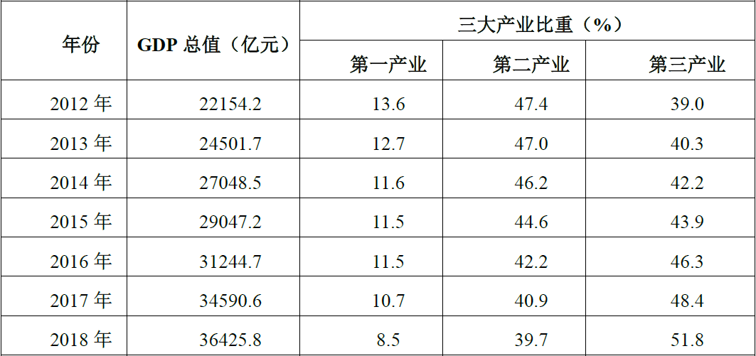 近几年湖南省产业结构不断优化。2012年三次产业比为13.6:47.4:39.0,第二产业占比最大,随着产业结构调整加速,湖南省第一产业、第二产业占比不断下降,第三产业占比不断提高,2016年湖南省第三产业占比首次超过第二产业,占比达到46.3%,并在2018年占比超过50%,达到51.8%。2018年湖南省三次产业结构由2017年的10.7:40.9:48.4调整为8.5:39.7:51.8,第一、第二、第三产业增加值同比分别增长了3.5%、7.2%和9.2%,对经济增长的贡献率分别为4.0%、40.9%和55.1%。