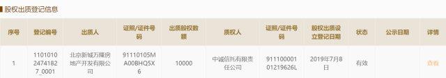 北京新城金郡房地产开发有限公司(下称“北京新城金郡”)日前新增股权出质登记信息,登记编号110101024741827_0001,出质人为新城金郡全资控股股东北京新城万隆房地产开发有限公司,出质股权数额为10000,质权人为中诚信托有限责任公司。